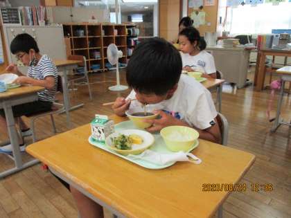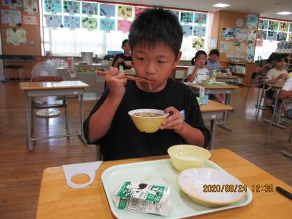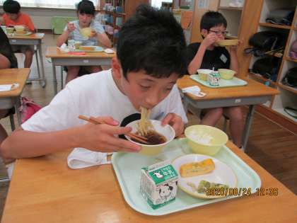 給食に富山の名物・ブラックラーメンが出ました!ラーメンを「ずるずるっ」とすする音が教室に響いていました。