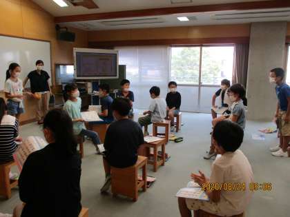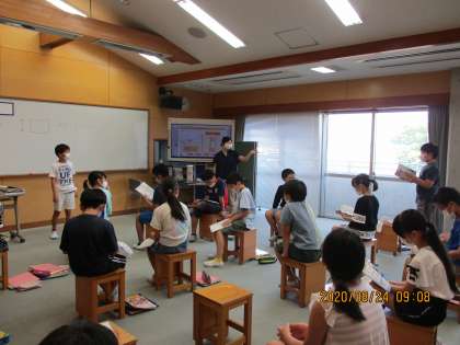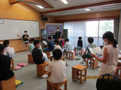 英語の学習でジェスチャーゲームをしました。単語の意味を覚えたり、英語を書いたりと、2学期も英語を身に付けようと頑張っています!