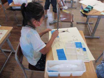 3年生は図工の時間に水彩画に取り組んでいます。自分が小さくなったつもりで写真を撮ってその写真を画用紙に貼ります。そして、その周りに行ってみたい世界を描いています。文房具の世界や恐竜の世界等、楽しい世界が広がっています。