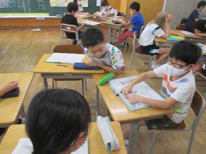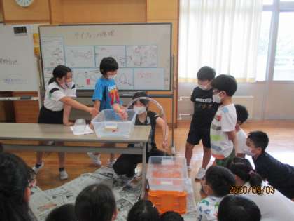 社会科では、十二貫野用水について学習しています。今日は、山あり谷あり崖ありの山を越えて、どのように十二貫野大地に水を運んだのかを学習しました。「山に穴を掘ってトンネルをつくったのかな?」「バケツなどを使って水を運んだのかもしれない」等と当時の様子を一生懸命考えていました。サイフォンの原理を使って水を運んだことを知った子供たちは、実際にサイフォンの原理を見たことで現象の不思議や、サイフォンの原理を利用しようと考えた椎名道三のすごさを感じていました。
