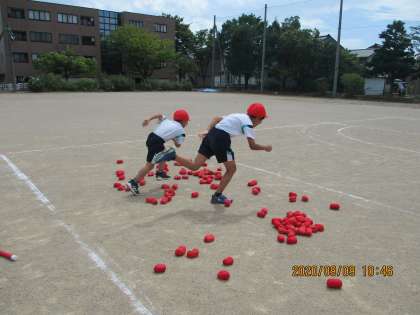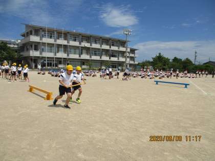 団体競技の練習をしました。今年度は、3年生と一本の棒を持って走り、玉を入れる「バランス玉入れ」です。5年生は、途中、平均台に乗るミッションが追加されています。3年生さんに「ここに並ぶよ」「ここから玉を投げるよ」と声を掛ける姿が頼もしかったです。3年生のよいお手本になれるよう、5年生、頑張りましょう!