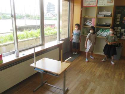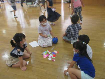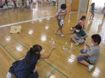 のびのびタイム、2組の子供たちが、1年生と一緒に遊びました。風船バレーやペットボトルボウリングをしたり、手裏剣で的当て等をしたりして遊びました。「1年生ととても仲良くなることができた」「1年生が笑顔になってくれてよかった」などと振り返り、充実した時間を過ごした様子でした。