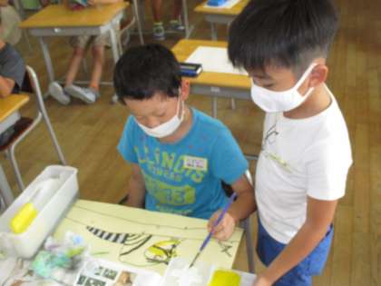 今日は金曜日ですね。週の終わりですが、どのクラスも暑さに負けず、真剣に授業をうけていました。1組は、社会の中間発表会、2組は図工の○○ワールド、3組はプログラミングの写真です。