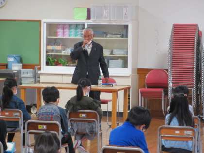 今日の総合的な学習の時間は、ゲストティーチャーに元自治振興会会長の山藤さんと初代光陽小学校PTA会長の鋪田さんをお招きしてお話を聞きました。