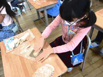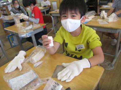 図画工作科の時間に釘打ちに挑戦します。木材を組み合わせて釘で打ち、生き物を作ります。まずは触り心地のよい作品にするために、念入りにやすりをかけました。子供たちは「すべすべで気持ちがいい〜」と言いながら作業をしていました。