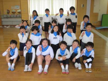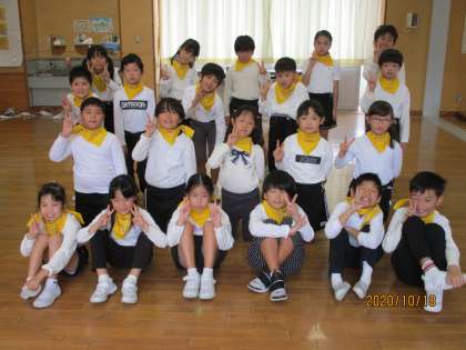 学年全員での集合写真です。演技を終え、笑顔いっぱいの子供たちです。
