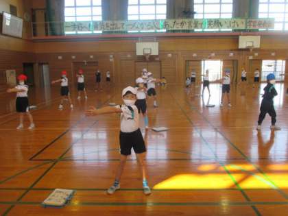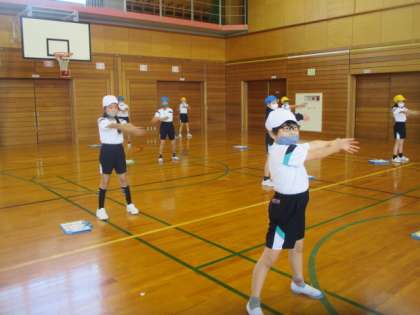 1・2組は1時間目に体育を行いました。初めて行うラケットベースボールのルールを知った後、ラケットで遠くへ「打つ」ためのブンブン体操等を行いました。
