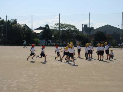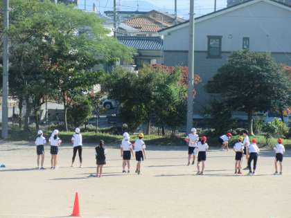 今日はとてもよい天気でした。青空の下、グラウンドで思い切り体育の学習に取り組む子供たちです。