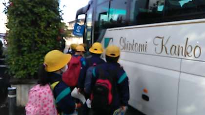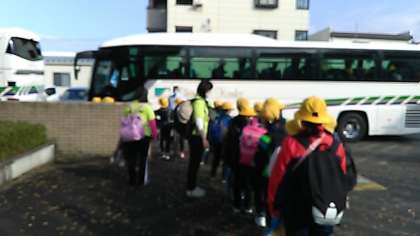 雨を心配していましたが、よい天気になりました。4年生バスに乗ります。