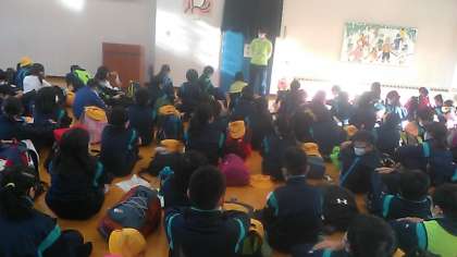 クラフトが終わり、先生の話を聞いています。