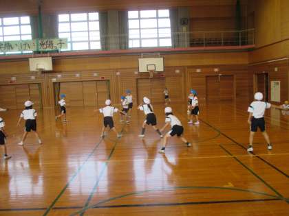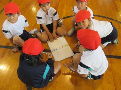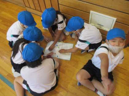 体育の学習「とっぱおに」では、ホワイトボードを使って作戦を考えています。攻め、守りとあらゆる作戦のパターンを考えながら実践しています。