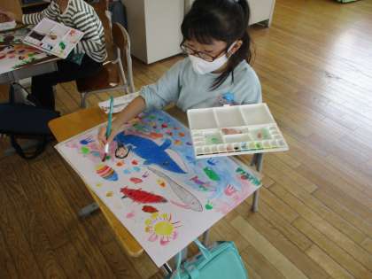 水彩道具を持ち帰りますので、パレットやバケツ、筆、雑巾等、きれいに洗って保管をお願いします。(自分で洗うことができるよう、声をかけていただければありがたいです。)
