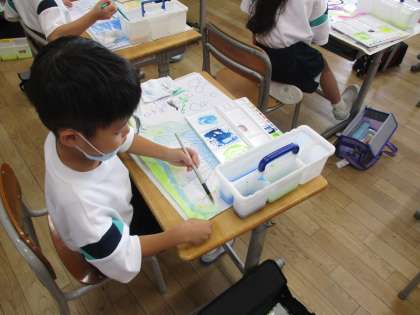 図画工作科〜のってみたいな いきたいな〜の学習は、子供たちが待ちに待った水彩を使って背景を描く活動でした。