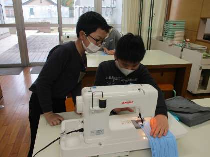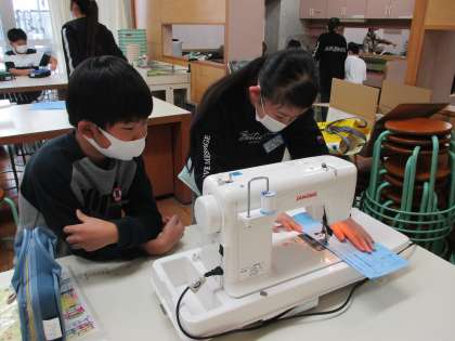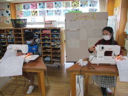 初めて使うミシンにドキドキワクワク!!慎重に縫い進めています。