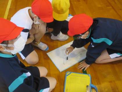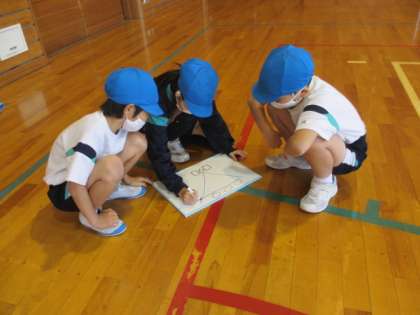 ラケットベースボールの試合に向けて、チームで作戦を立てました。攻めの時の打順や守りの時の担当場所等、ホワイトボードを使って考えました。次回は早速試合をします。楽しみですね!