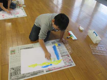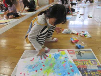 今日の図画工作科で「とろとろえのぐでかく」の学習をしました。液体粘土に絵の具を混ぜ、筆ではなく手や指を使って描きました。普段味わうことのない感触に子供たちはとても楽しそうでした。
