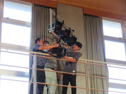 子供たちが帰った後、教職員で体育館器具庫やステージ横の片付けをしたり、照明器具を設置したりしました。