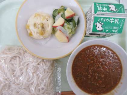 今日の献立は、ソフト麺のカレーソース、むしパン、白菜とりんごのサラダ 牛乳 です。