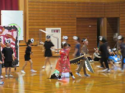 1年生の劇「おたまじゃくしの101ちゃん」。いろいろな生きものになりきって、元気いっぱいに演技する姿がとても可愛らしかったです。