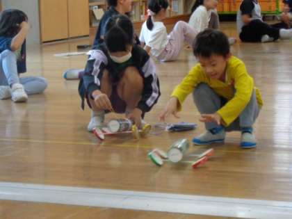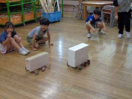 先生がつくったゴムで走る車で遊びました。これから、一人一人が「とっておきの車」を目指して活動します。「とっても速く走る車にしたい」「カーブする車にしたい」など、どんな車をつくりたいのかについても考えました。