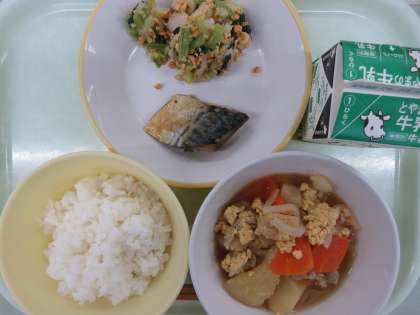 今日の献立は、ご飯、牛乳、さばの味噌煮、いり大豆和え、卵とじ です。