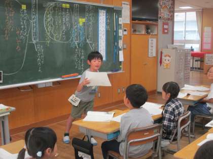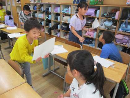 「お手紙」を読んで、何度も窓をのぞくかえるくんの気持ちを考えました。かえるくんの心の中の言葉を考え、かえるくんになりきって友達に伝えました。