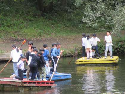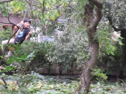 子供たちがとても楽しみにしていた「池遊び」。ターザンロープ、池ジャングル、いかだに挑戦しました。