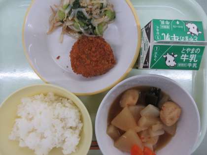 今日の献立は、ご飯、牛乳、メンチカツ、ごまびたし、おでん です。