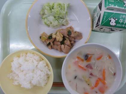 今日の献立は、ご飯、牛乳、あっさりチキン、ゆでキャベツ、秋のかおりシチュー です。