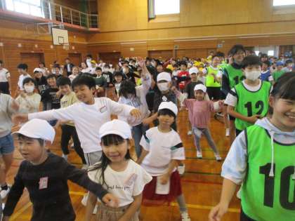 今日の昼休みは全校集会がありました。縦割り班のメンバーと協力しながら楽しいゲームを2つ行いました。