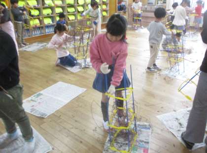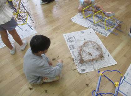 大事に育てていたあさがおのつるを使って、リースを作りました。支柱に巻きついたつるをほどくのは、なかなか大変でした。