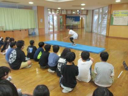 係活動の様子です。得意なマットの技をクラスのみんなに披露しています。難しい技をたくさん披露してくれました!