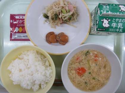今日の献立は、ご飯、牛乳、ほたての照り焼き、切り干し大根のペペロンチーノ、かき玉汁、しそかつおふりかけ です。
