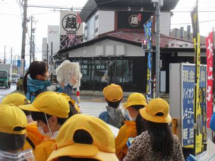 子供たちは、「ここの店のチャーシュー麺、すごくおいしいよ!」「この変わったつくりの建物、何かなって思ってたんだよね」「ここのお店、お父さんとお母さんがよく行くよ」などと言いながら、楽しく調査活動をしていました。