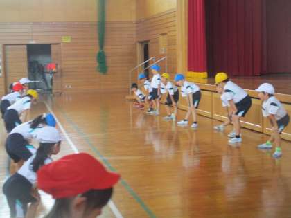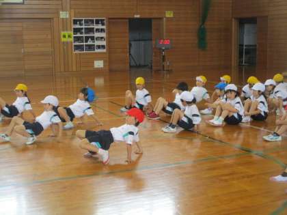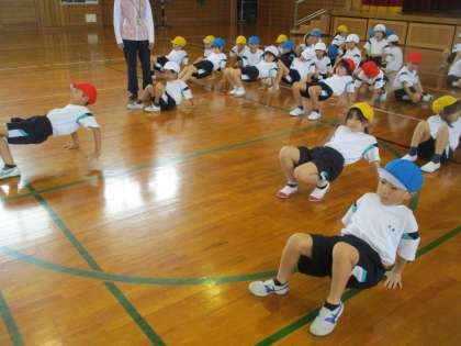 マット運動をするために、腕や足の力を鍛えています。動物になりきって歩く子供たちです。