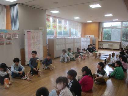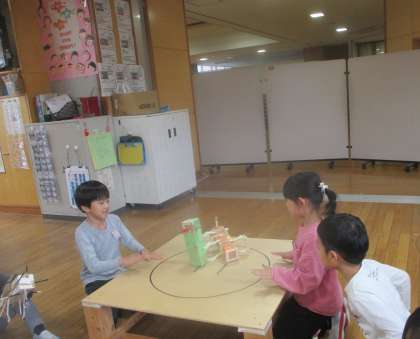 1組のお友達から誘いを受けて、1,2組でとんとんずもうの対戦をしました。強くなるように工夫しながらつくったとんとんずもうは、本日で最後です。