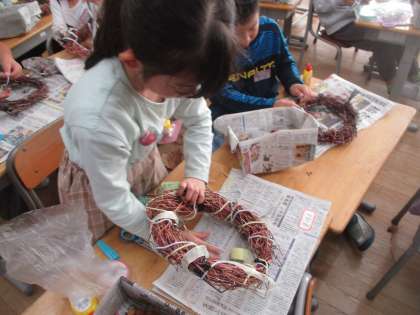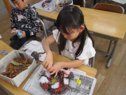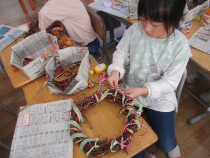大事に育ててきたあさがおをリースにしました。家から持ってきた毛糸やリボンを巻いたり、秋見つけで見つけたドングリや葉っぱを飾りつけたりしました。