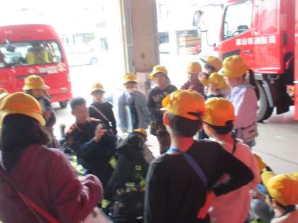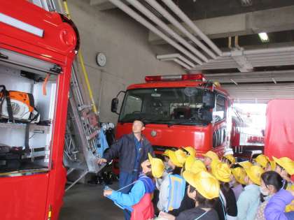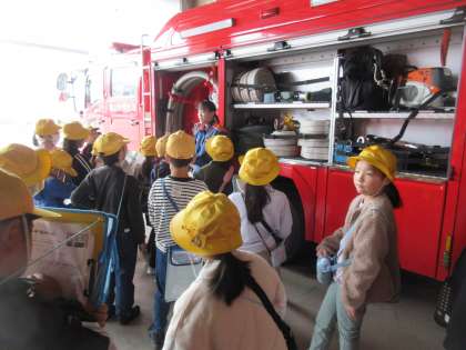 消防車を見せていただき、設備や積んでいる道具のこと等、たくさん教えてもらいました。消防車の秘密がたくさん分かりましたね。