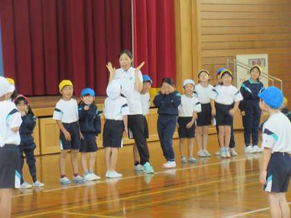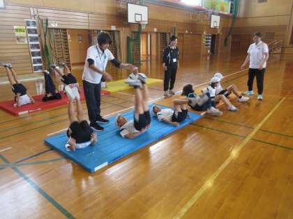 講師の方をお招きし、一緒にマット遊びをしました。たくさん褒めてもらって、技能だけではなく、やる気もぐんとアップした子供たちでした。