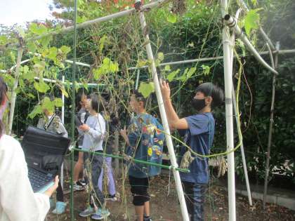 11月になって、葉が枯れ始めたり、実が茶色くなったりしてきたヘチマ。今後のお世話をどうしたらよいか話し合いました。