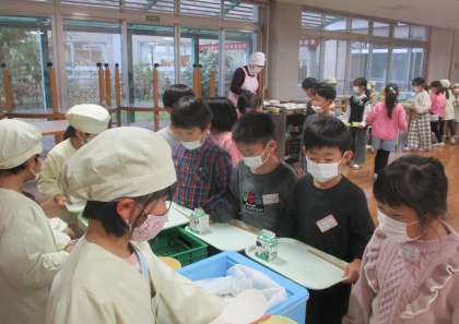 今日は、学年ランチルーム会食を行いました。入学してから初めて、教室以外の場所で、給食を食べたので、とてもワクワクした様子の子供たちでした。