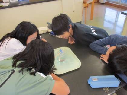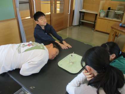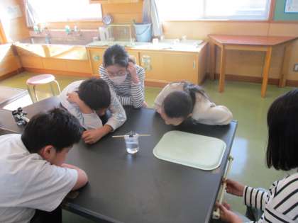 食塩が水に溶けていく様子を観察しました!よく見ると、もやもやとしたシュリーレン現象が観察できます!