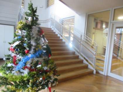 大きなクリスマスツリーがお目見えしました。 学校の中がぱっと明るくなりました。