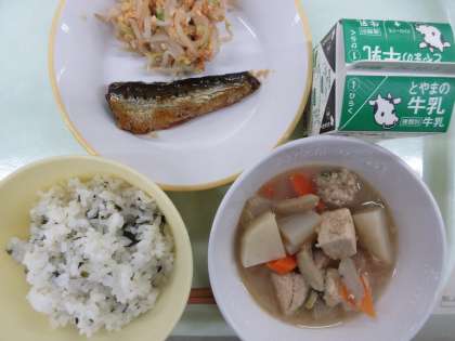 今日の献立は、わかめご飯、牛乳、いわしの梅煮、炒り大豆和え、ごまけんちん です。