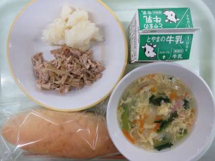 今日の献立は、コッペパン、牛乳、豚肉の甘辛煮、粉ふきいも、卵のふわふわスープ です。