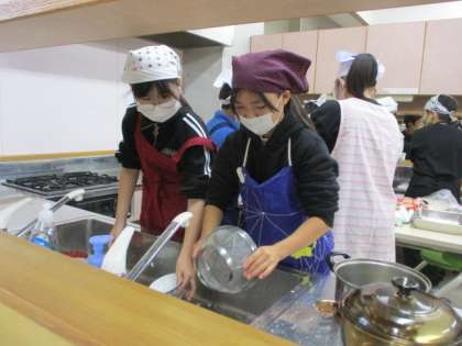 調理実習で、ご飯とみそ汁をつくりました。具材を切ったり、食器を洗ったり役割分担をして取り組んでいます。