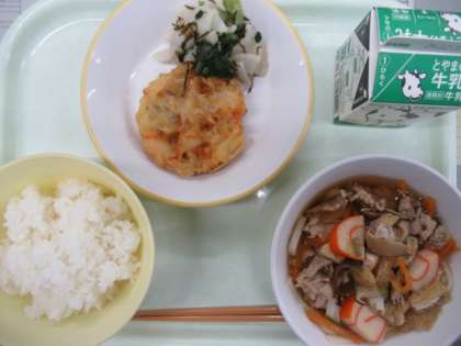 今日の献立は、ご飯、牛乳、野菜かき揚げうどん、やちゃら です。