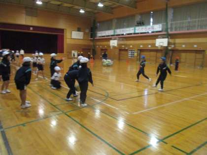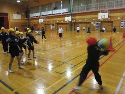 体育の時間に、四角ドッジボールの試合をしました。どうしたら相手にボールが当たるのか、同じ団の友達と声を掛け合う姿が見られました。