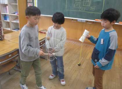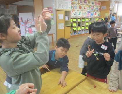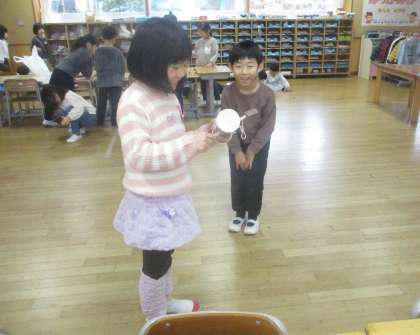 子供たち一人一人が作りたいと思った、あきのおもちゃを作っています。今日は、友達の作ったおもちゃで遊びました。五感を使いながら、秋を感じている子供たちです。
