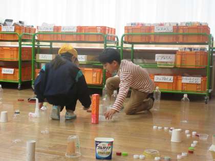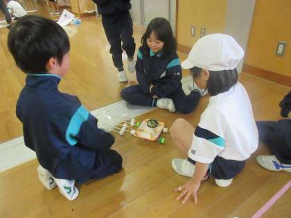 生活科「目ざせ!ぼく・わたしのとっておきの車」の学習でつくった車を使って、1年生の子供たちと一緒に遊びました。